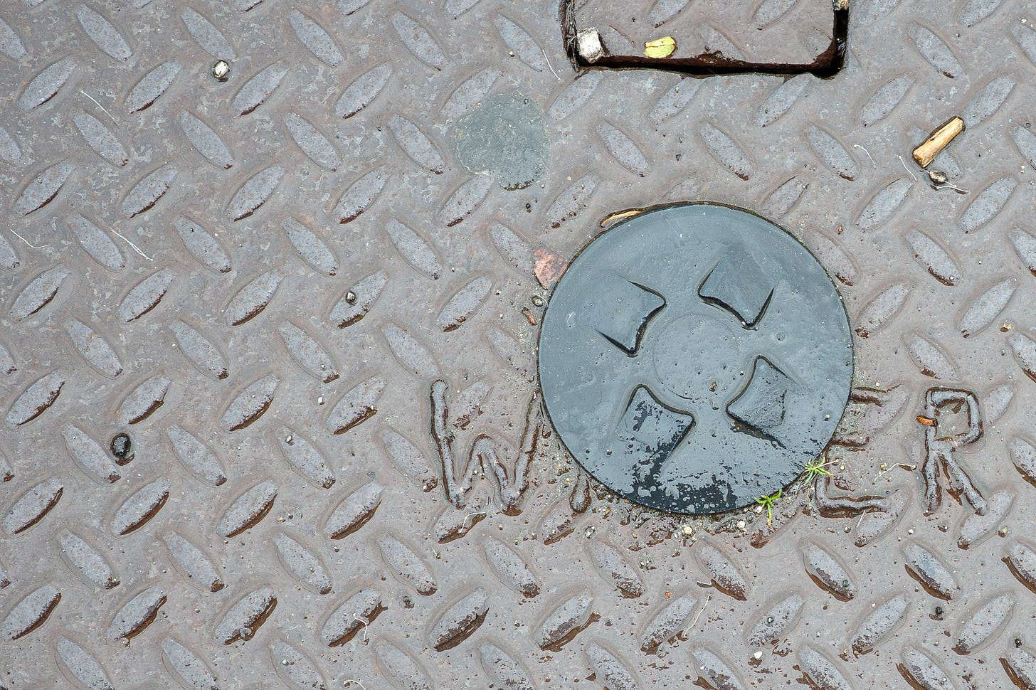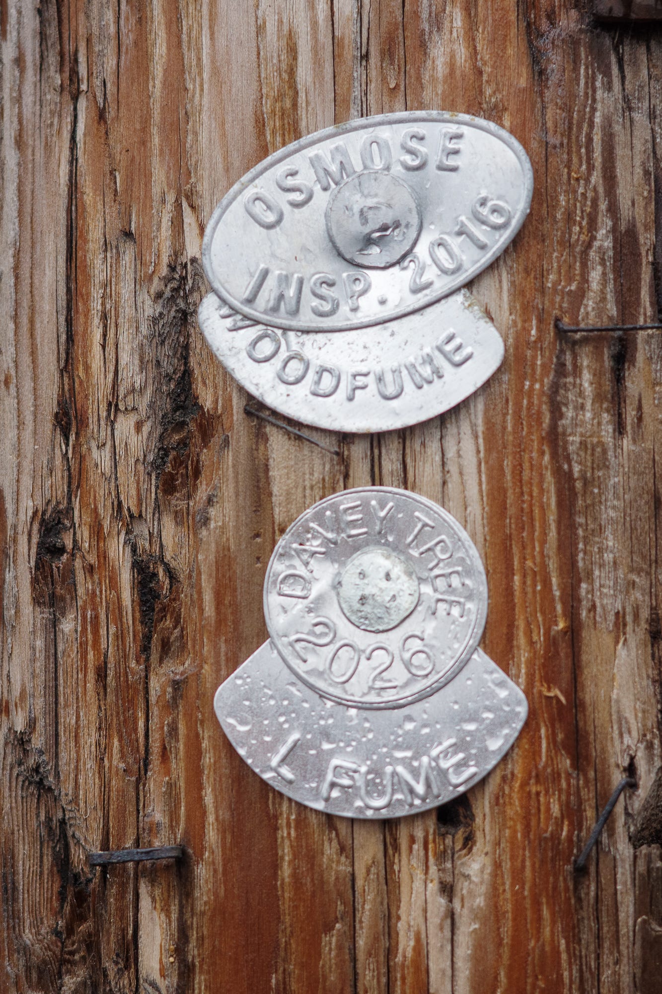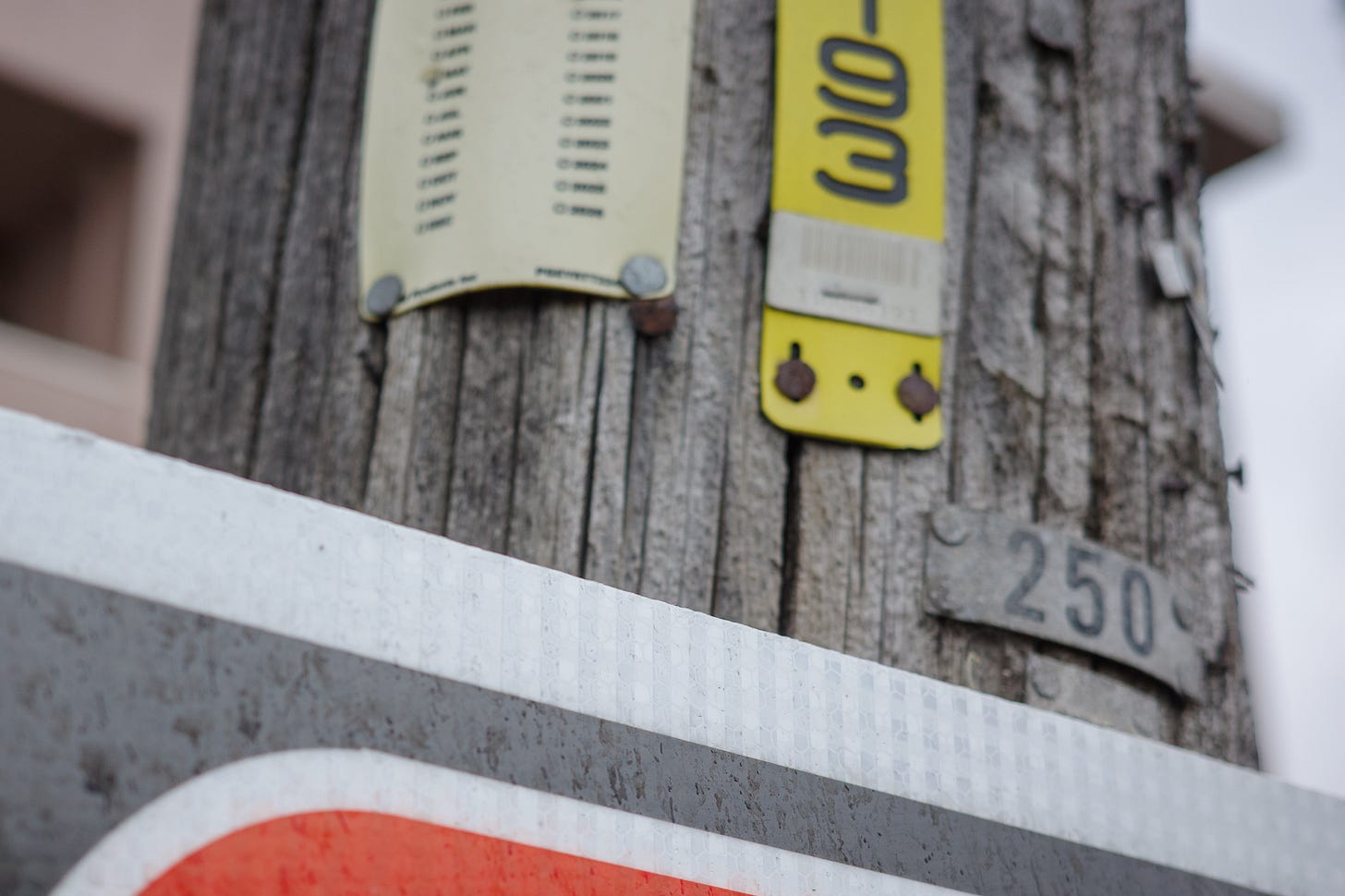 Numbers on a light pole identifying its location. Inspection tags stapled to telephone poles. Spray-painted arrows pointing to buried cables. Manhole covers labeled by the agency that installed them. Faded curb paint from long-forgotten parking regulations.