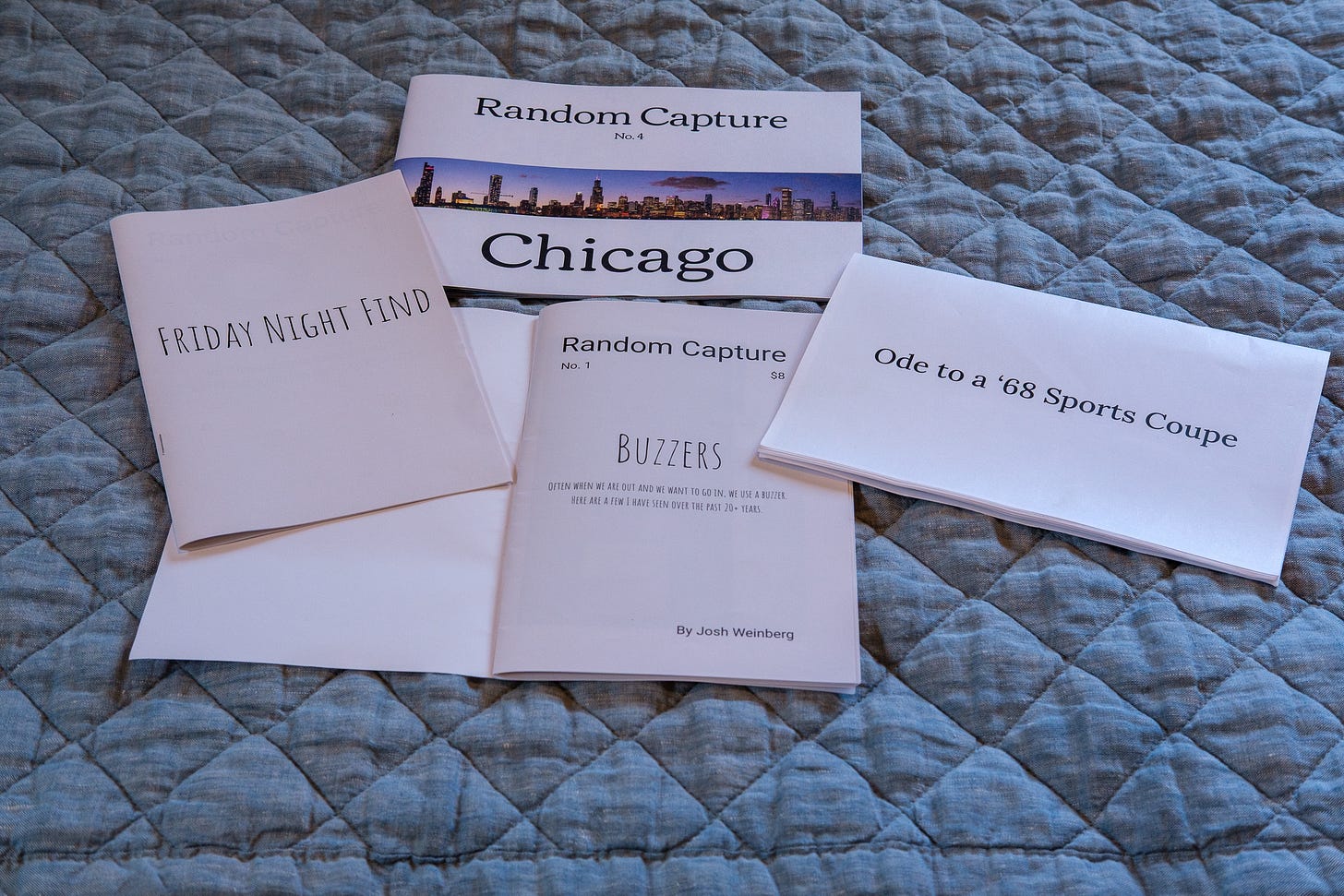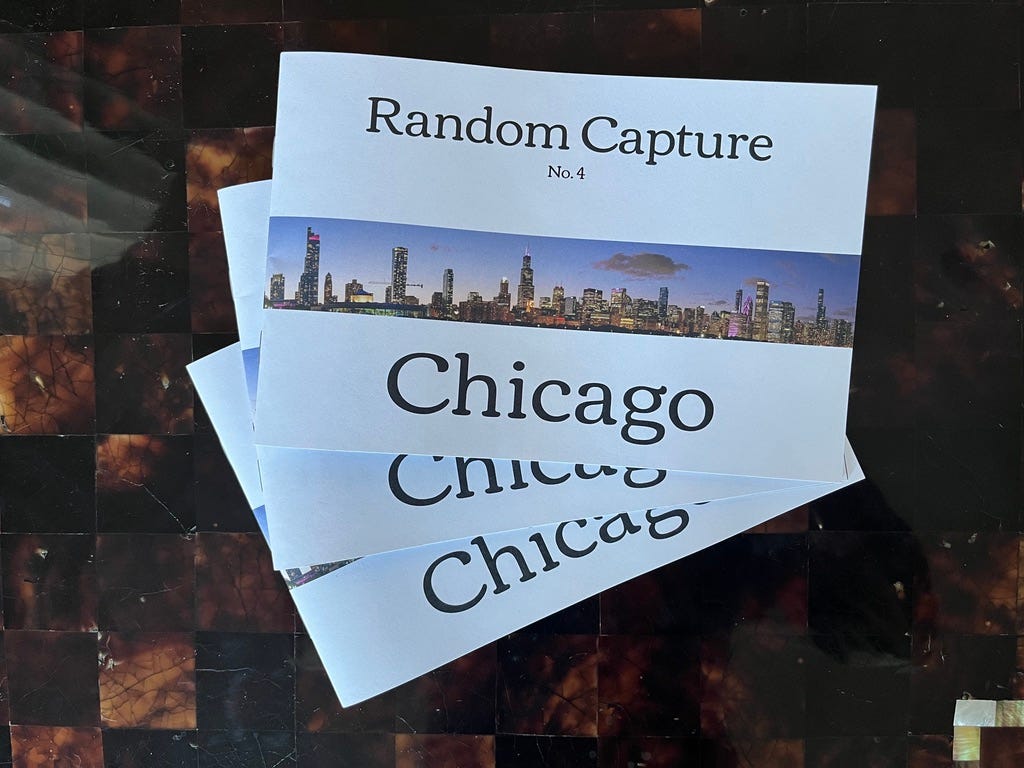 Over the past year, I began making zines myself: first pasting small prints into cheap notebooks, then creating hand-folded, laser-printed prototypes at home, and eventually publishing my professionally printed Chicago zine.